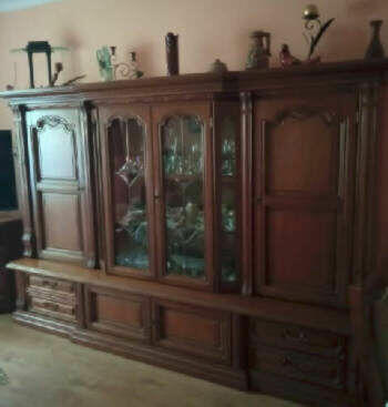 Regał wykonany z drewna w części oszklonej zamontowane podświetlenie. Wymiary: 1,7m wysoki , 2,4m długi i 0,8m głęboki.